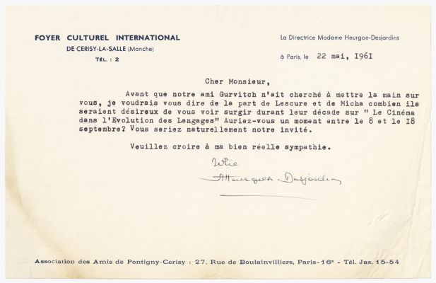 Il y a 60 ans, ma mère Anne Heurgon-Desjardins invitait ainsi Edgar Morin à rejoindre Cerisy pour la décade Le cinéma dans l’évolution des langages, entre le 8 et le 18 septembre 1961, où Jean Lescure et René Micha souhaitent le voir « surgir ». Ce surgissement a-t-il eu lieu ? Je ne puis le dire… En revanche, je me souviens avoir dansé un 14 juillet au bal du village avec Edgar. Plusieurs rencontres intégrant un 14 juillet sont possibles : en 1954, Progrès technique et justice sociale, dirigé par Daniel Mayer (j’étais un peu jeune !) ; en 1956, Politique et spiritualité, dirigé par Jacques Madaule, Gabriel Marcel, Jean-Marie Domenach et Alban Vistel ; en 1957, Le langage, avec l’Abbé Morel, Jean Follain, Henri Gouhier, Eugène Ionesco, Charles Lapicque, Gabriel Marcel, René Poirier, Francis Ponge, Boris de Schloezer, Jean Tardieu... ; en 1958, L’Histoire et ses interprétations. Autour d’Arnold Toynbee, dirigé par Raymond Aron ; en 1959, Problèmes actuels du socialisme, dirigé par Gilles Martinet, André Philip, Alain Touraine… L’énigme de la première venue d’Edgar à Cerisy reste entière.